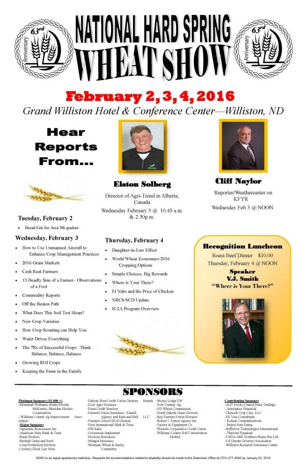 The annual National Hard Spring Wheat Show will be held Feb. 2-4 at the Grand Williston Hotel and Conference Center. The event provides an opportunity for producers to network, learn about new agriculture innovations and ideas and hear from leading experts in their field. Admittance to the 63rd Annual Hard Spring Wheat Show is free but there is a $10 fee for meals. Contact 701-577-4595 for more information.