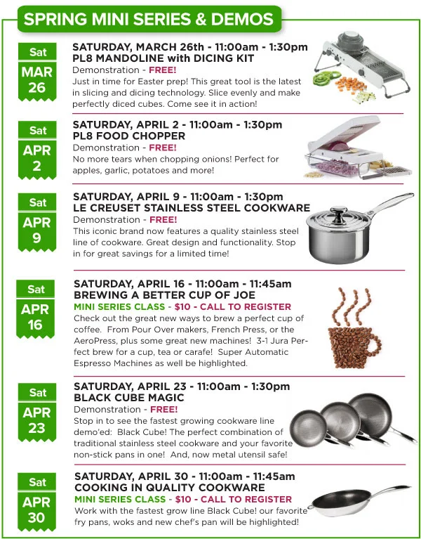 Back to All Events Cooking in Quality Cookware Mini Class Saturday, April 30, 2016 11:00 AM 11:45 AM Cooks on Main 224 Main Street Williston, ND, 58801 United States (map) Google Calendar ICS