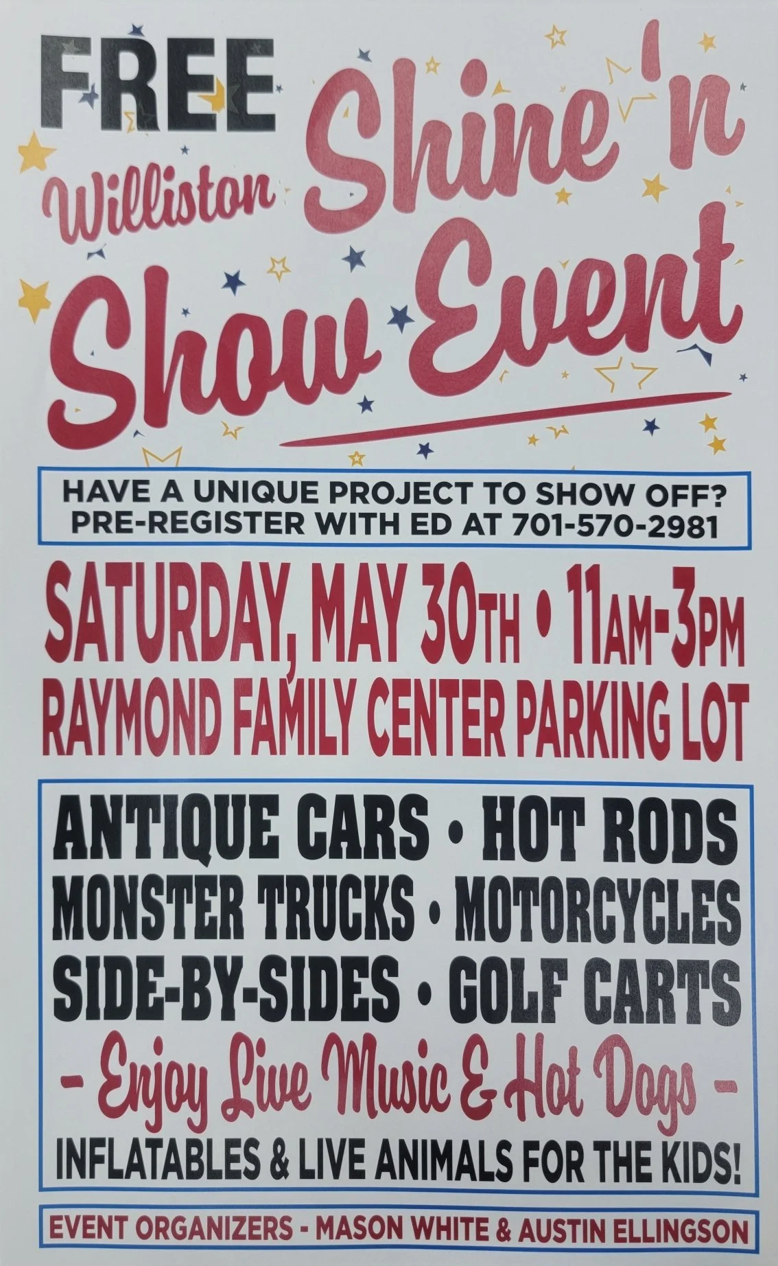 Back to All Events Williston Shine 'n Show Event Saturday, May 30, 2026 11:00 AM 3:00 PM Raymond Family Community Center 1002 11th Street West Williston, ND, 58801 United States (map) Google Calendar ICS